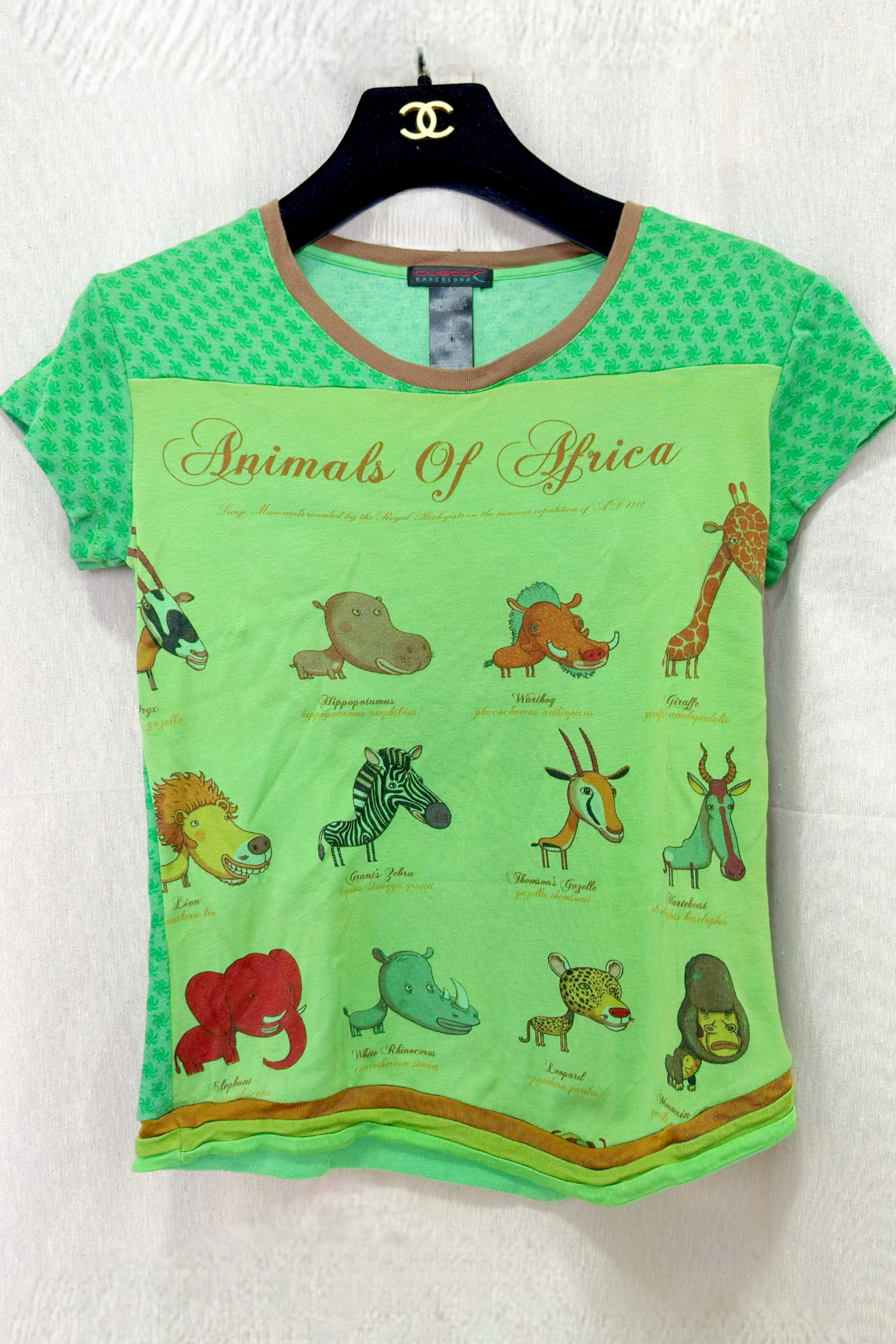 Camiseta verde brillante con ilustraciones de animales africanos estilo cartoon y texto en inglés. Estilo fitted, con mangas cortas y cuello redondo ribeteado en marrón. Estampado central de estilo educativo retro con nombres científicos ficticios y bordes decorativos. Recuerda a prendas de los 2000 con estética infantil divertida, ideal para looks nostálgicos con jeans anchos o faldas de tablas.
