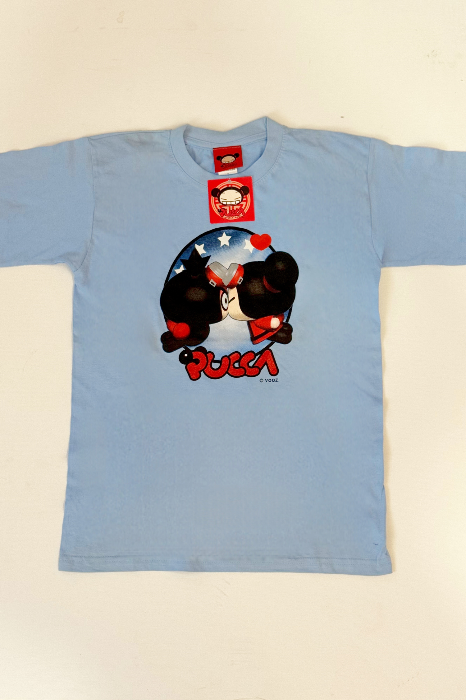 Camiseta azul cielo con ilustración original de Pucca besando a Garu, con fondo de estrellas y detalles rojos vibrantes. Una pieza nostálgica directamente sacada de los 2000, con etiqueta original de la época. Ideal para combinar con falda vaquera, pantalones cargo o para llevar con cinturón sobre vestido ajustado.