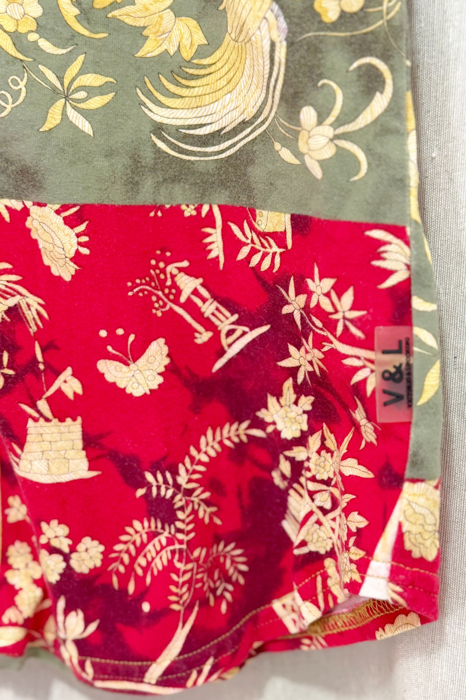 Camisa corta de manga remangada con estampado patchwork de inspiración oriental. Mezcla de motivos florales, aves y paisajes en tonos rojos, dorados, verdes y crema sobre base de algodón fino. Cuello camisero con interior de flores liberty, cierre de botones y corte recto. Recuerda a los looks atrevidos y eclécticos de los 2000, perfectos para combinar con pantalones de pinza o minifaldas vaqueras y plataformas.