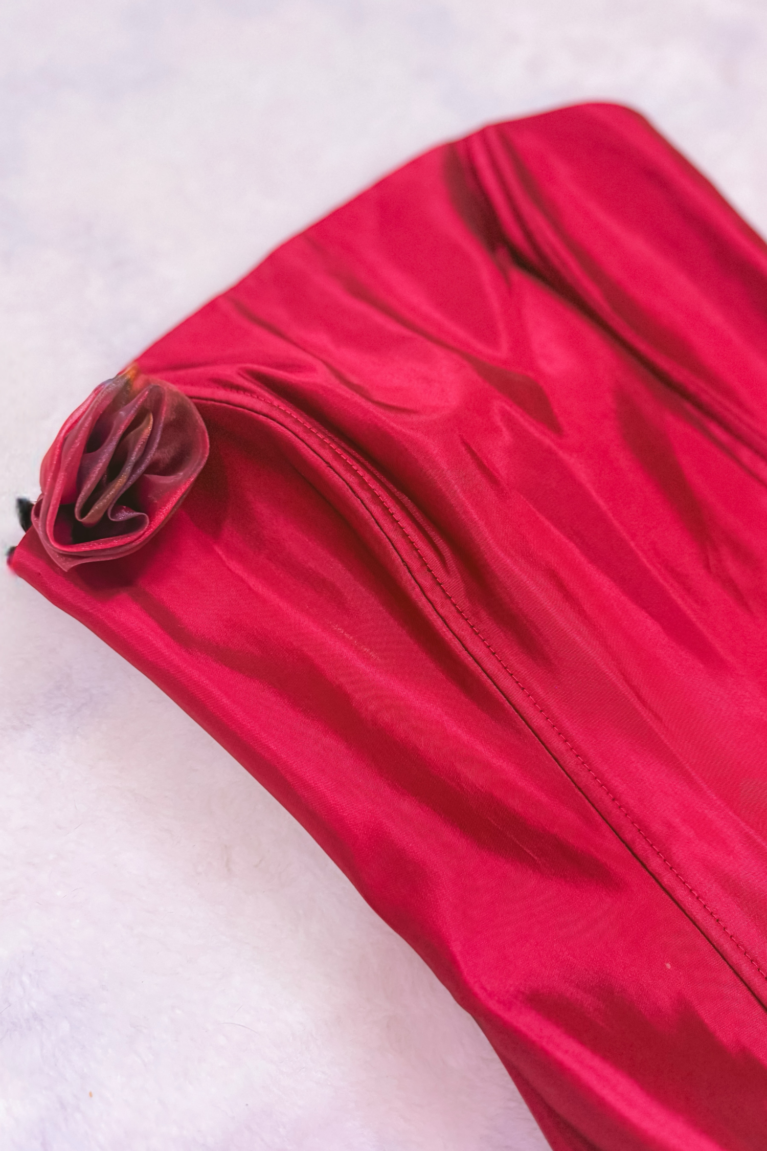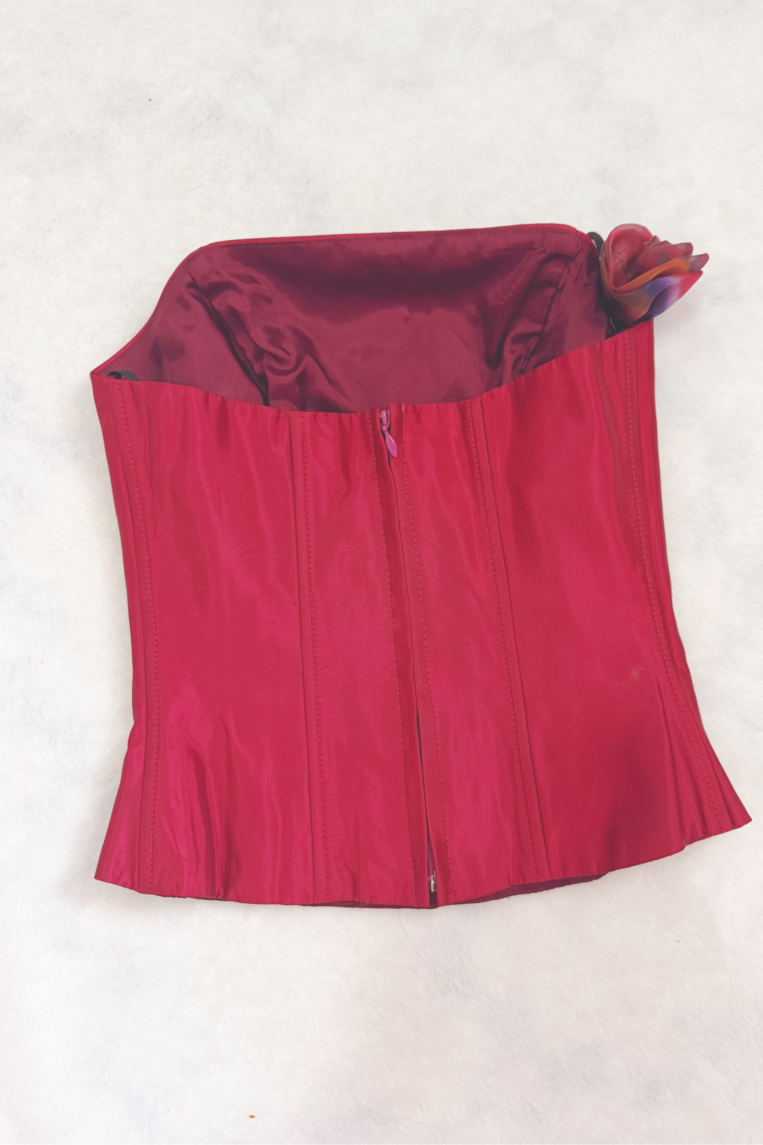 Top tipo bustier en tejido satinado rojo intenso con estructura entallada, ballenas suaves y escote palabra de honor. Diseño minimalista, con efecto push-up natural y cierre trasero. Una pieza poderosa y sexy que grita popstar energy, perfecta para combinar con vaqueros, minifalda o pantalón sastre para una noche inolvidable. ¡Queda espectacular puesto!