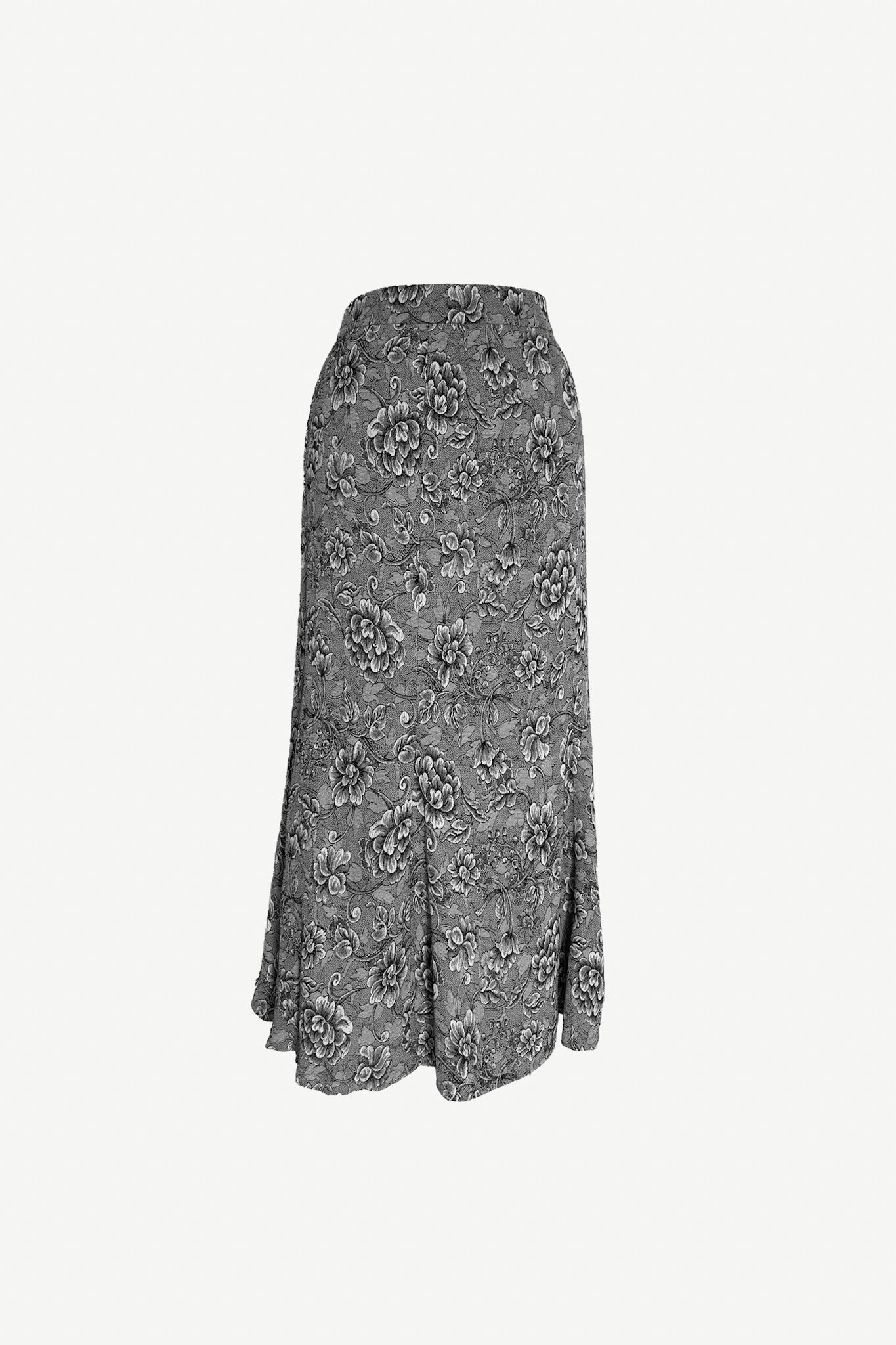 Si Phoebe Buffay tuviera que elegir una falda para tocar la guitarra en Central Perk, probablemente sería esta. De largo midi, con vuelo suave y un delicado estampado floral en tonos grises, tiene ese aire nostálgico y bohemio que definía sus looks más icónicos. La silueta favorecedora y el tejido fluido le dan movimiento sin perder estructura, perfecta tanto para un look relajado con camiseta como para elevarla con una blusa vintage o un chaleco bordado.
