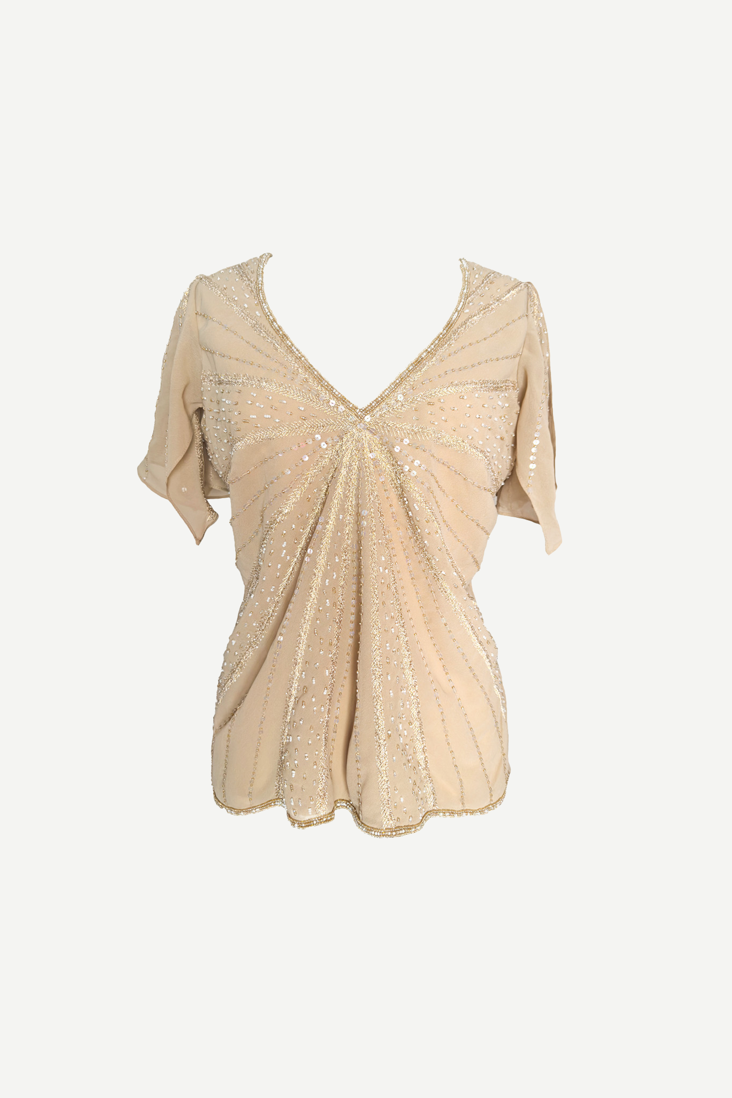 Este top bordado a mano con lentejuelas doradas es un guiño directo a los estilismos más icónicos de los 90 y principios de los 2000. Tiene un aire de Carrie Bradshaw celebrando el Año Nuevo en un ático neoyorquino, o de Jennifer Lopez en plena gira. Perfecto para aportar luz a cualquier look, ya sea con denim vintage o una falda de satén. Puede llevarse ajustado o de forma oversize, por lo que podría servir para tallas M-XL o 38-48 dependiendo de el look que se quiera conseguir. Pieza artesanal de colección.