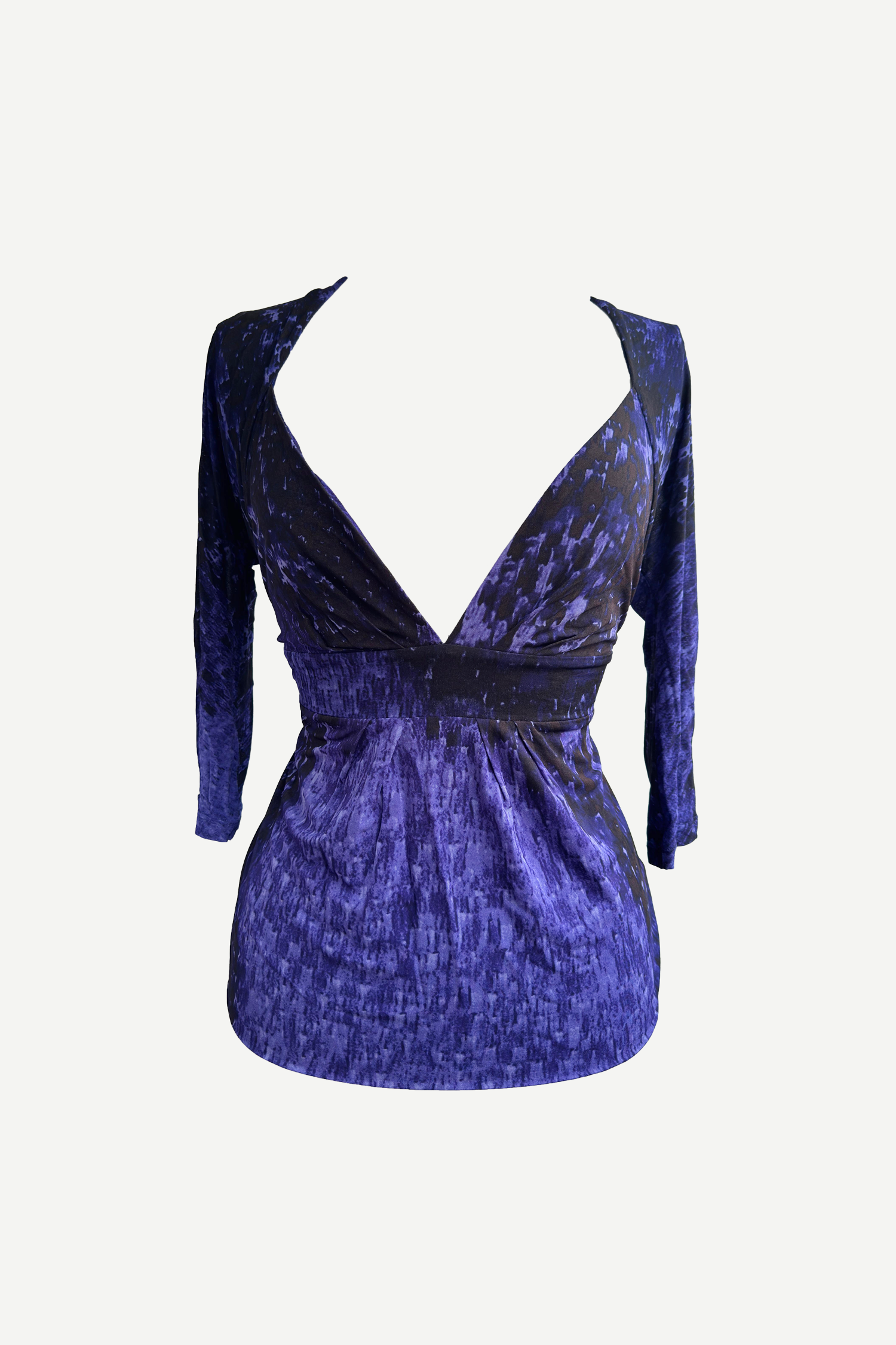 Este top de Roberto Cavalli es pura sofisticación noventera con esencia salvaje. Confeccionado en viscosa de alta calidad, su caída fluida abraza el cuerpo con suavidad, mientras que el escote profundo en forma de “V” y el fruncido en la cintura acentúan la silueta de forma hipnótica. El estampado en tonos morados y azulados tiene ese aire sensual y misterioso tan característico del Cavalli de los 90 y primeros 2000: un look que podría haber llevado Naomi Campbell o Carla Bruni en la Riviera italiana. Una pieza de gran rareza, de colección.