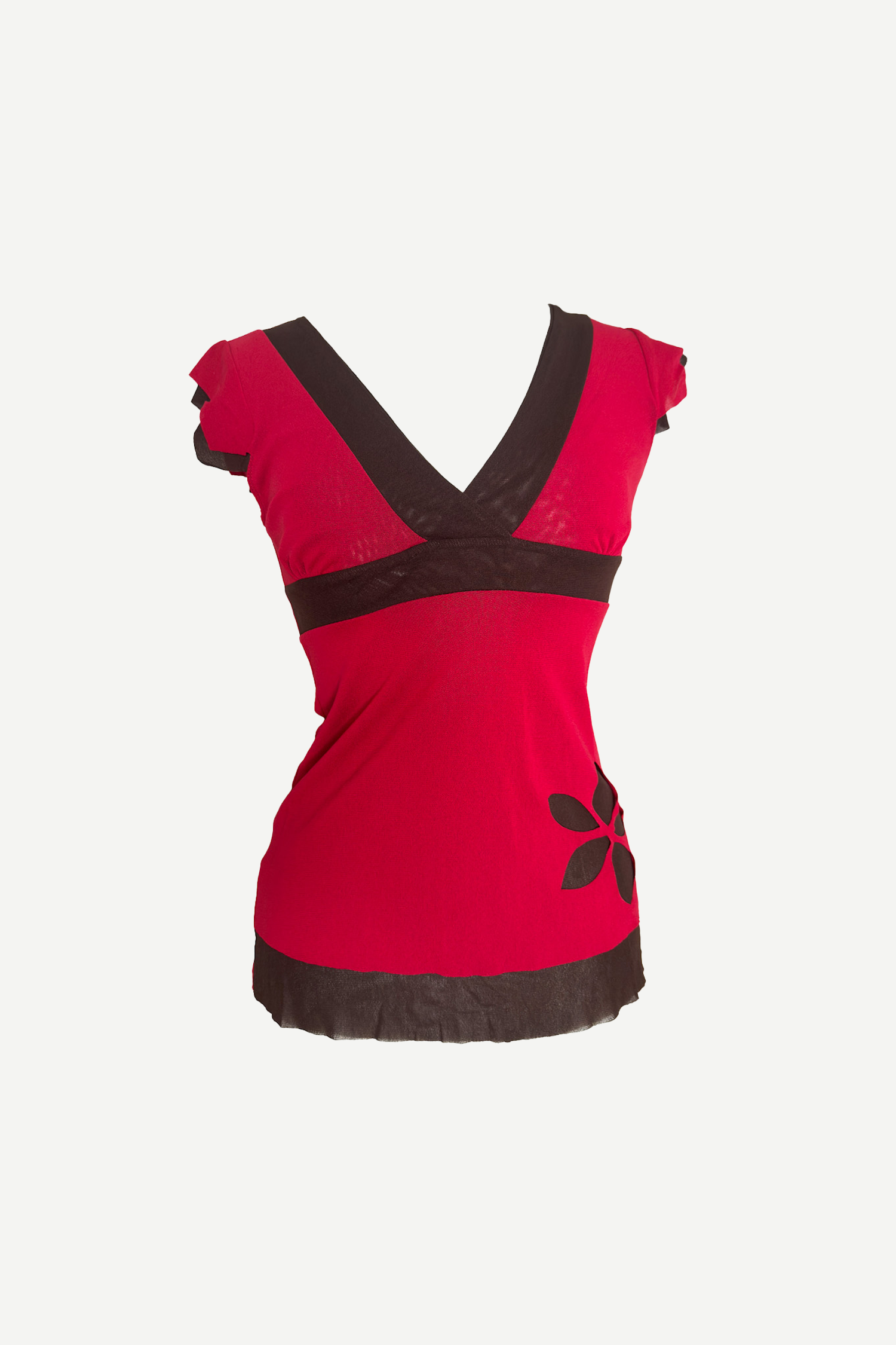 Este top es puro espíritu boho-chic de los 2000. Con escote cruzado en pico, cintura marcada y un diseño bicolor en fucsia intenso y negro, tiene ese a los looks de Lindsay Lohan en la película Mean Girls. El detalle de la flor aplicada en un lateral le da el toque gráfico que lo hace aún más especial.