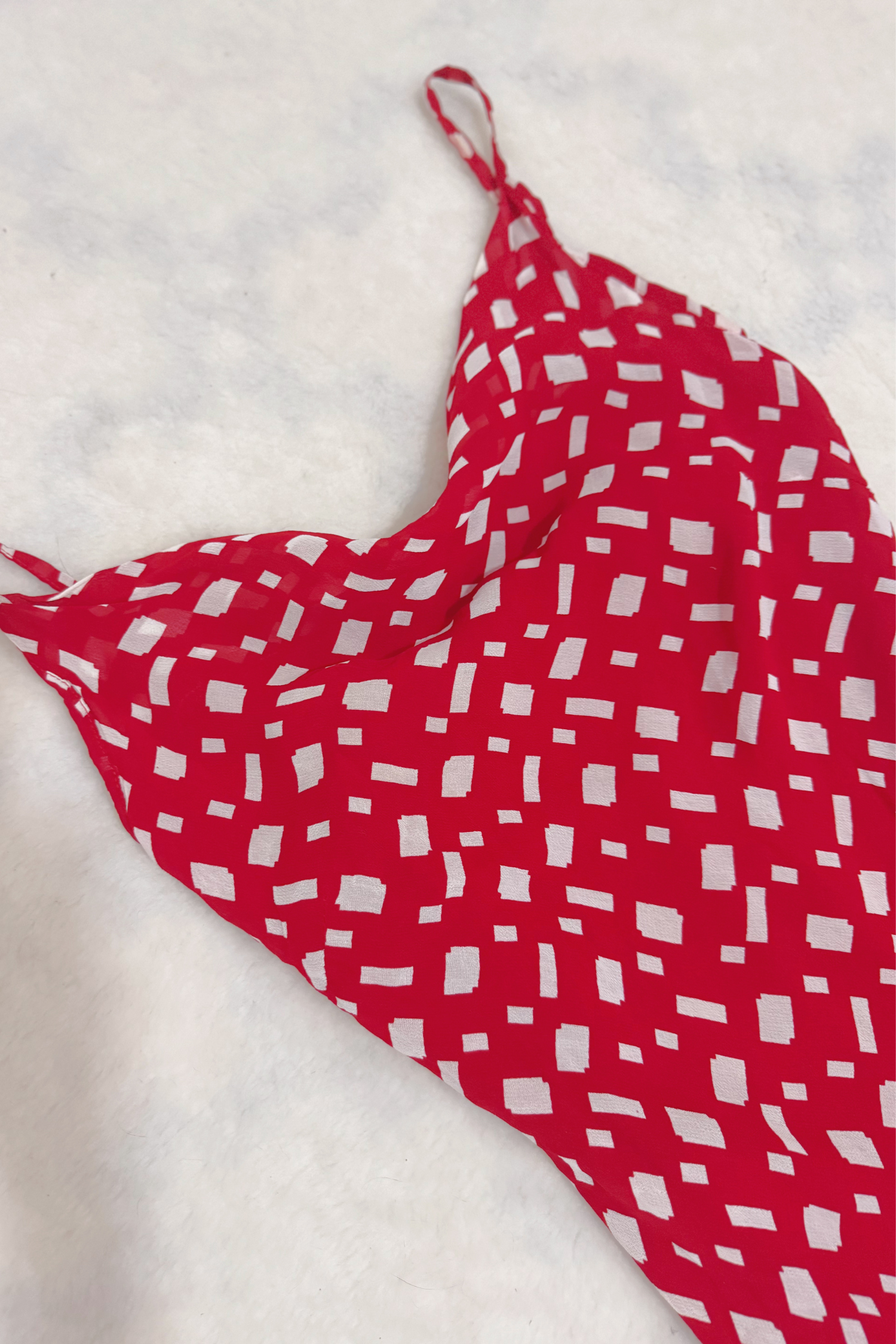 Vestido vintage en rojo vivo con estampado blanco de pequeñas figuras rectangulares. Escote tipo drapeado y tirantes finos ajustables. Corte entallado que realza la silueta con caída ligera tipo midi. Tela fresca, ideal para verano o entretiempo con una chaqueta vaquera. Muy 90s romantic cool girl vibes.